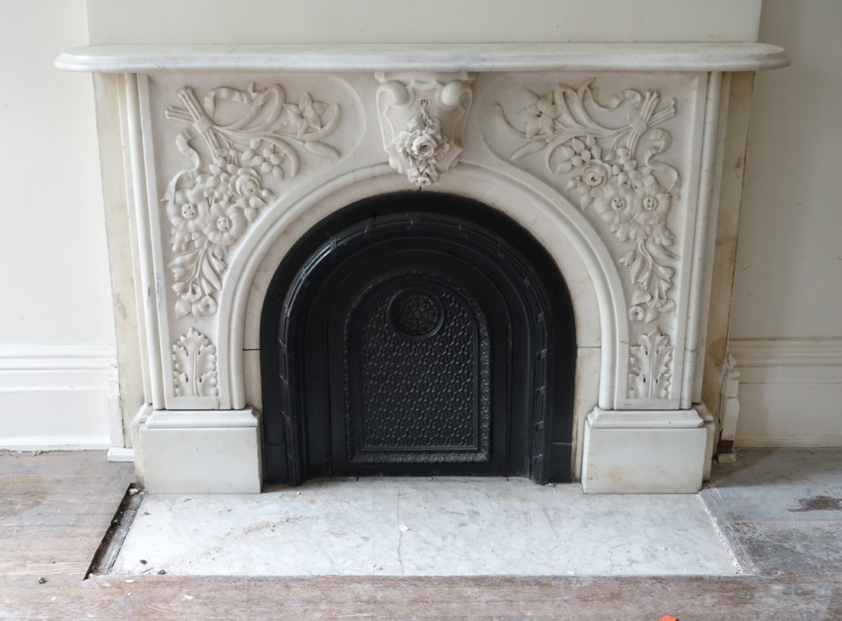 Here see our latest arrivals of reclaimed items that will be appearing in our NYC stores within a matter of days. These period white marble mantels are being carefully dismantled and made ready for resale as we write this post. They are being removed from a Large Victorian Era Brownstown home in Greenwich Village, New York City which sports some of the oldest standing architecture in lower Manhattan.