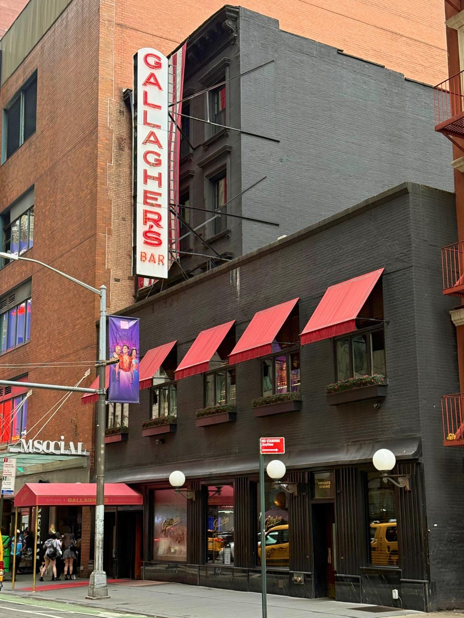 Founders Helen Gallagher and her husband, Ed, opened the speakeasy in 1927. Helen was a former Ziegfeld Follies girl and Ed was a stage comedian. Two years later, Ed passed away and Helen married Jack Solomon, a gambler and sports enthusiast. The partners reinvented the speakeasy into a steakhouse when Prohibition ended. Gallaghers attracted a crowd of athletes, racetrack legends, sports enthusiasts, mobsters and, later, Theater District stars. Notable guests include James Cagney, Jaqueline Onassis, Mickey Mantle, Frank Sinatra, Babe Ruth, Sean Penn, Aretha Franklin, James Gandolfini, Al Pacino, and Derek Jeter.
