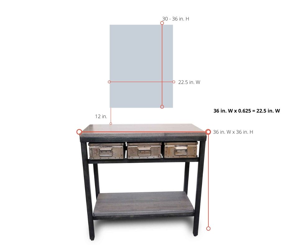 To choose the best width for an accent mirror, estimate between 50- to 75 percent of the width over an accent table, console, or couch. Accent tables are generally between 30 to 36 in. high. Mirrors should be approximately the same height but can be six inches taller or shorter. To estimate the total exact proportionate width of the table calculate width x 0.625 = the perfect width mirror for the table, console, or couch.