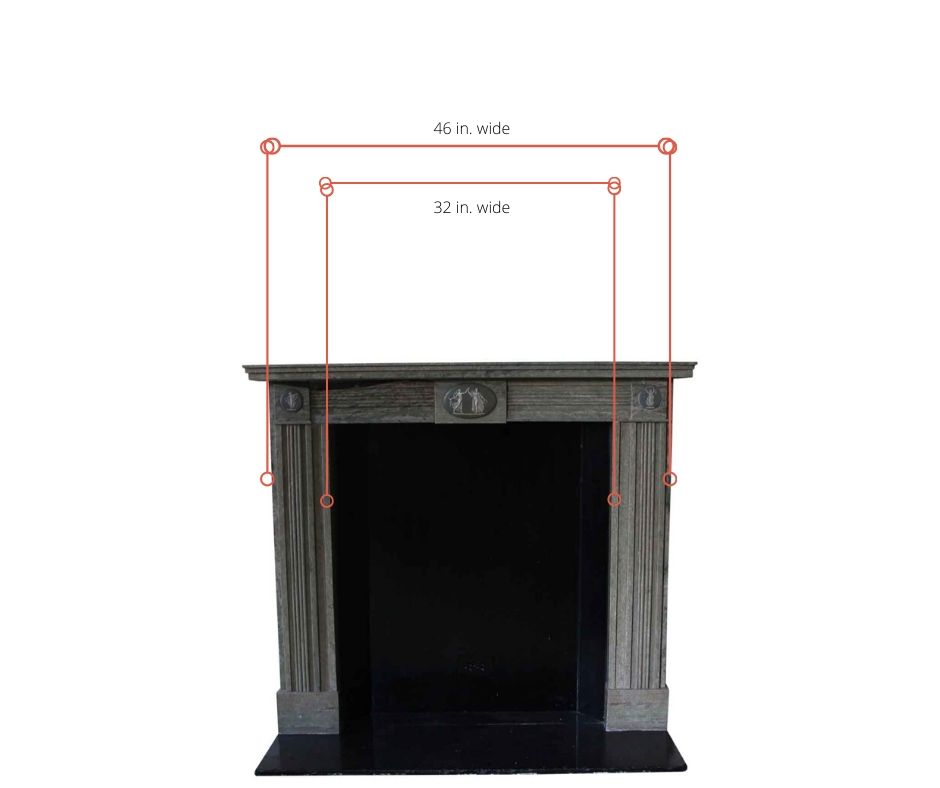 When choosing the size of the mantel mirror or even works of art, use the natural line of the mantel as a guide. The opening of the mantel and vertical side supports of your mantel are the ranges you want to aim for. The mantel is below 50 in. wide, and its natural lines are 46 in. & 32 in. wide. You generally want to stay around those sizes if you desire a well-proportioned mantel mirror.
