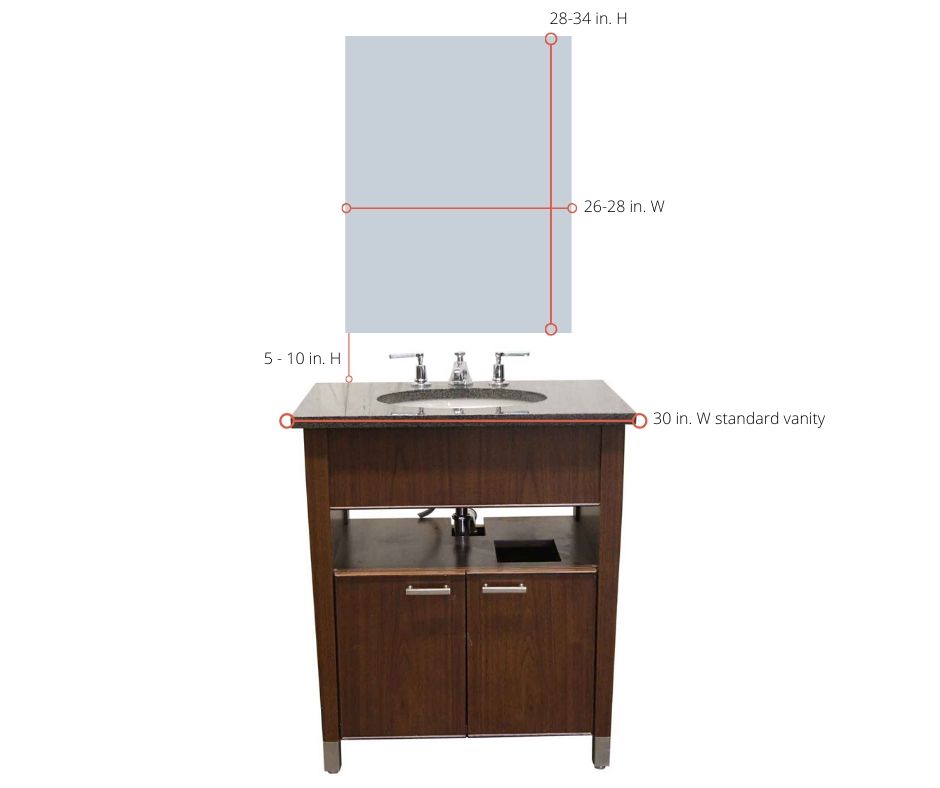 As a general rule, a vanity mirror should measure several inches less than your vanity sink area. For example, a 30 in. wide vanity should be paired with a 26-28 in. wide mirror. As far as the height, it depends on your ceiling height and your personal eye level. Standard vanity mirrors are usually 28-34 in. high.