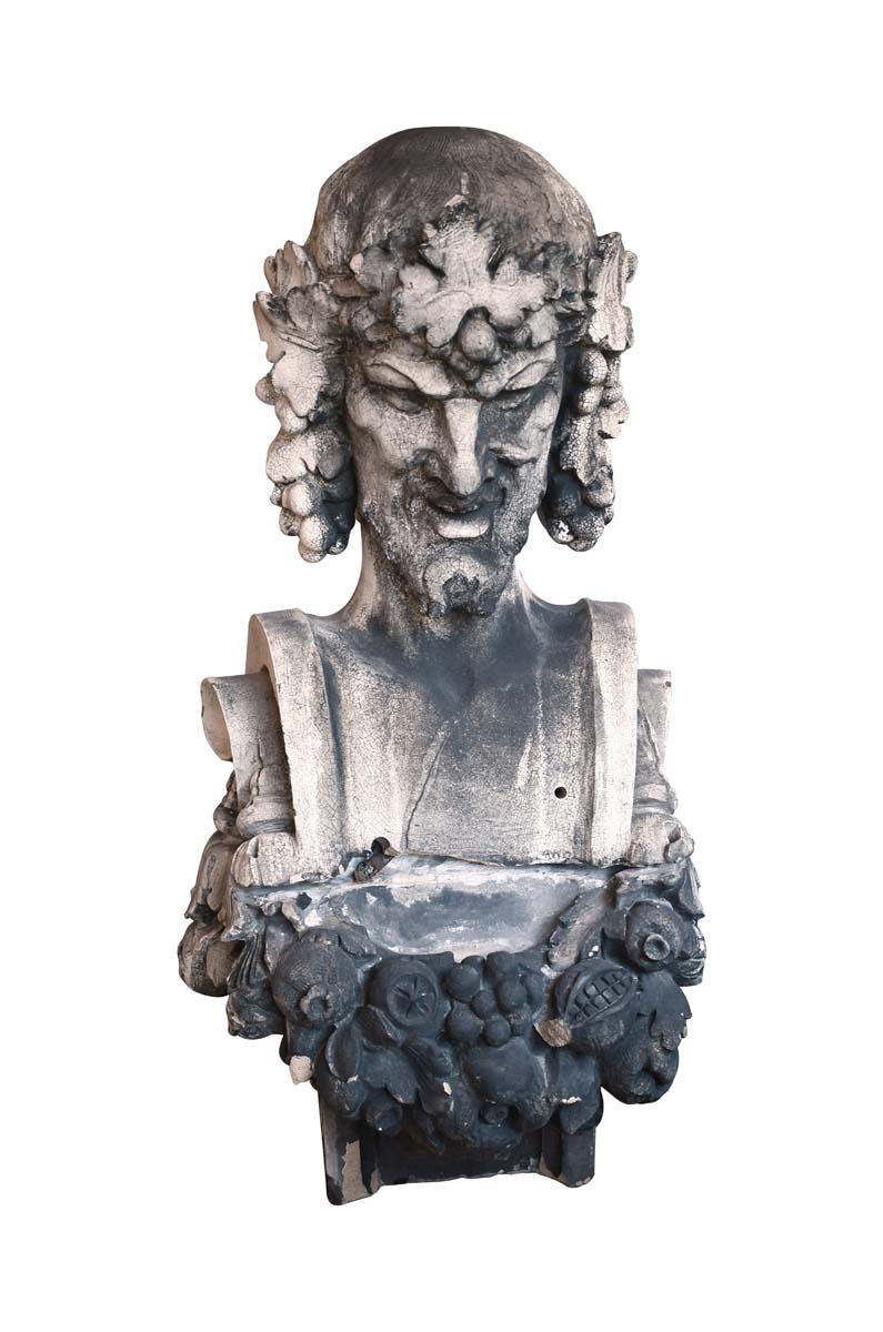 The statues were cast in two pieces, the top is hollow with a terra cotta outer surface and the bottom is filled with brick with a terra cotta outer surface. This construction allowed for easy transport and weight stability. The separation can be filled with a cement compound that will be resistant to outdoor weathering if you decide to keep the piece outside. To clean the surface of the statues, a softer approach, such as a soft-bristled brush and a biological cleaner, will remove biological growth and weathering staining. We have a small quantity in stock with various conditions. Please contact our sales team for more details.