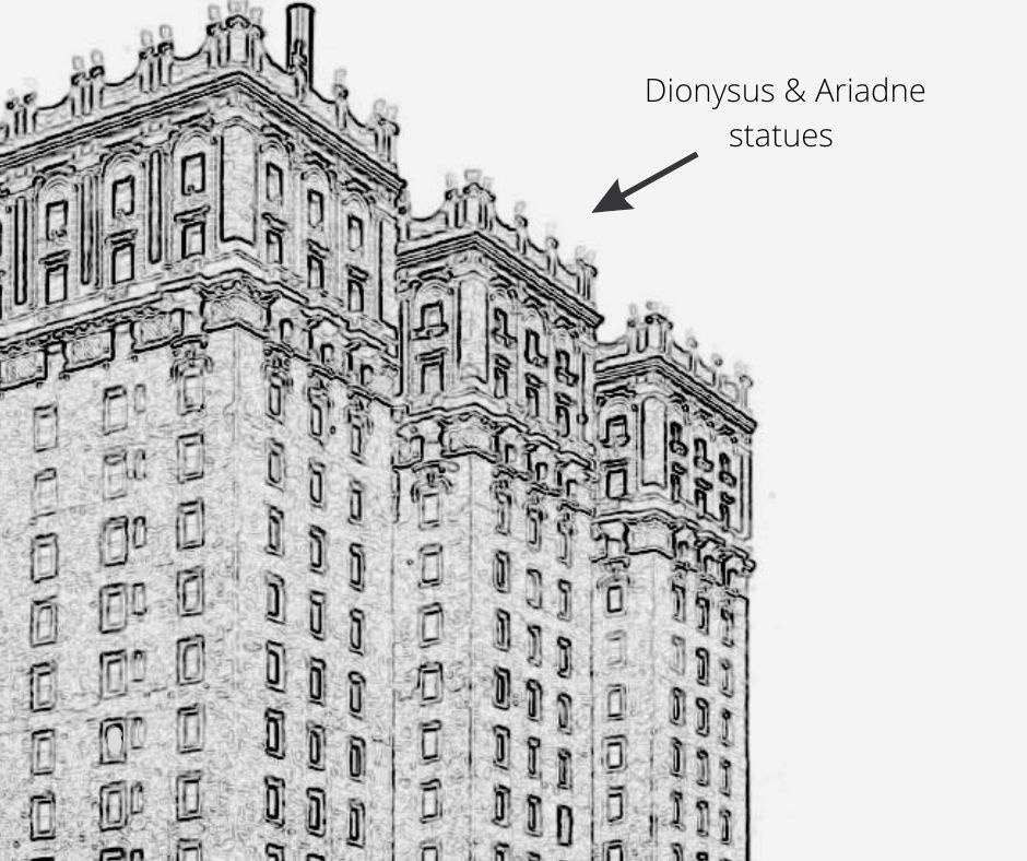 Olde Good Things acquired a small quantity of 5-foot Greek god Dionysus and his wife goddess Ariadne. (Dionysus and Ariadne are Greek names. Bacchus and Libera are their Roman names.) These one-of-a-kind antique statues were recently removed from the top of the Vanderbilt Hotel. Let’s learn the history of the Vanderbilt Hotel and Dionysus and Ariadne themselves.